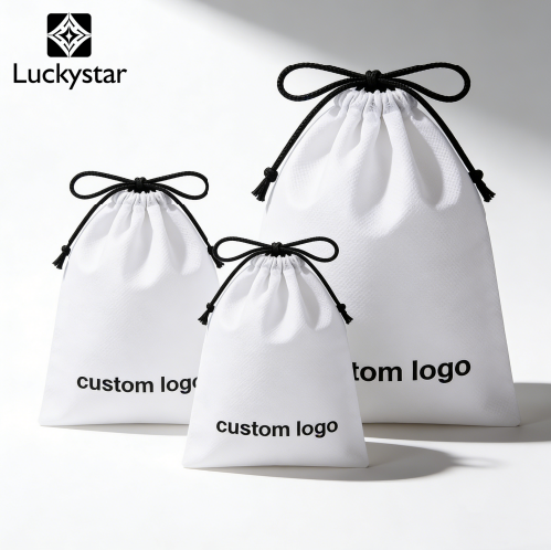 Нетканый экологичный складной мешочек для хранения ювелирных изделий на завязках с индивидуальным логотипом.