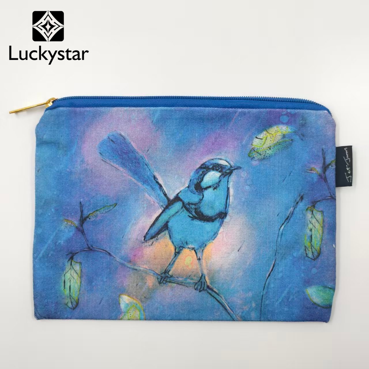 Косметичка с художественным принтом в виде птиц, синяя, с акварельным рисунком, с золотой металлической молнией.