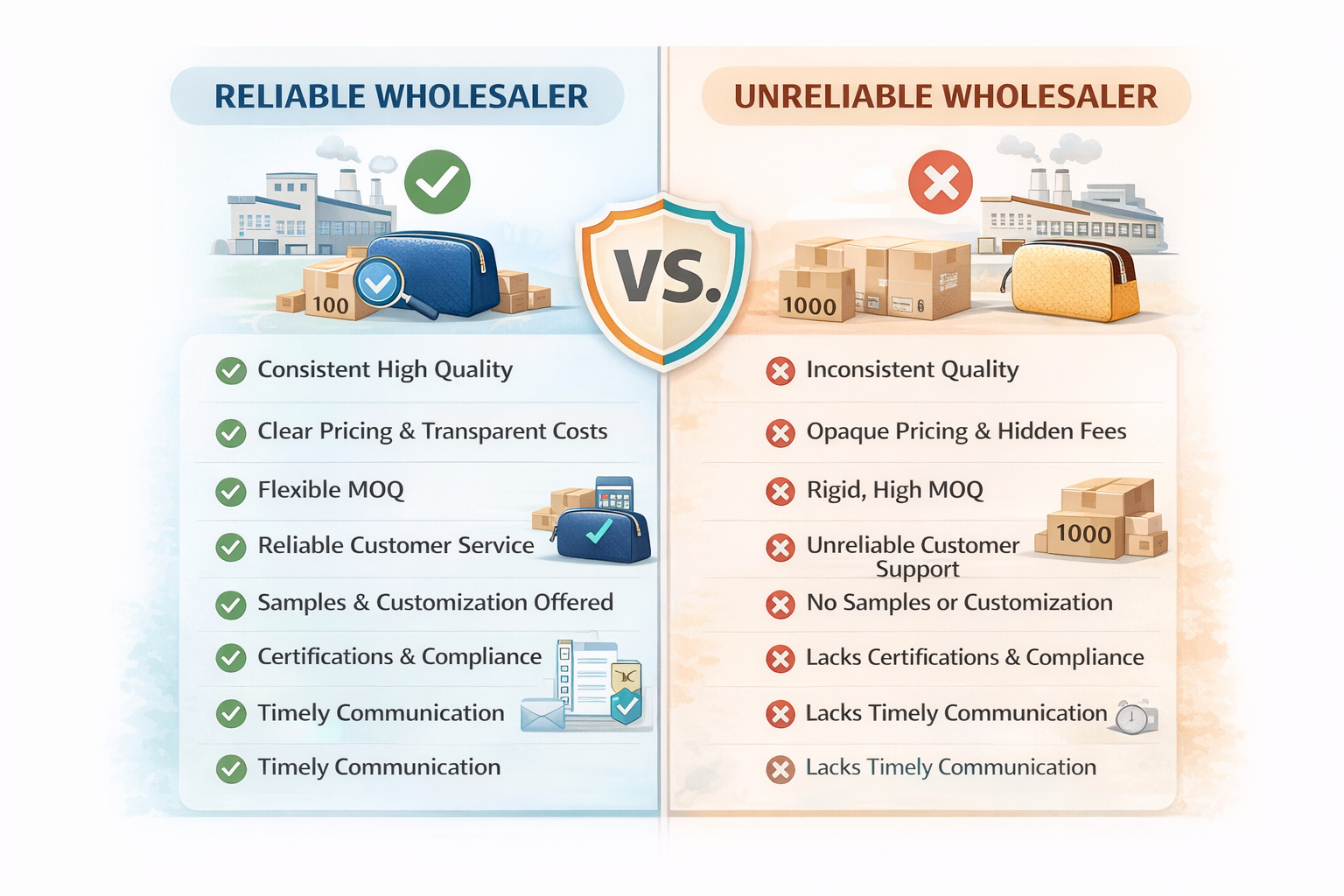 寻找可靠的化妆包批发商并不复杂。通过关注供应商的经验、质量控制、定制选项和清晰的沟通,您可以避免常见的采购陷阱,并与能够支持您业务增长的供应商建立合作关系。
